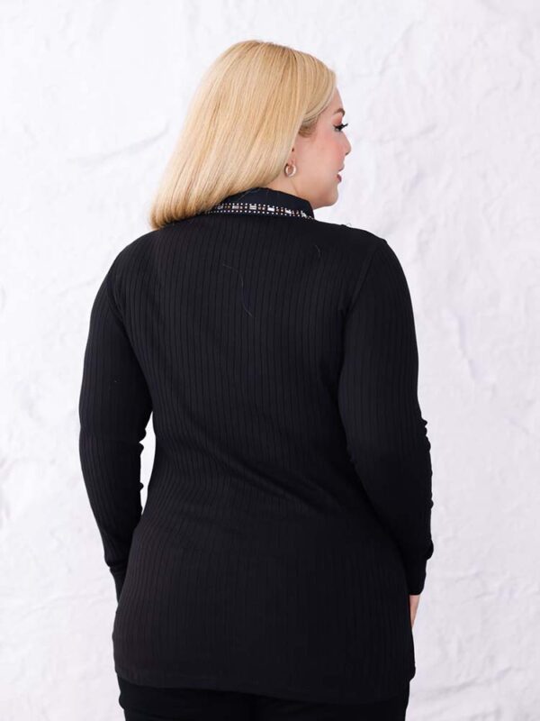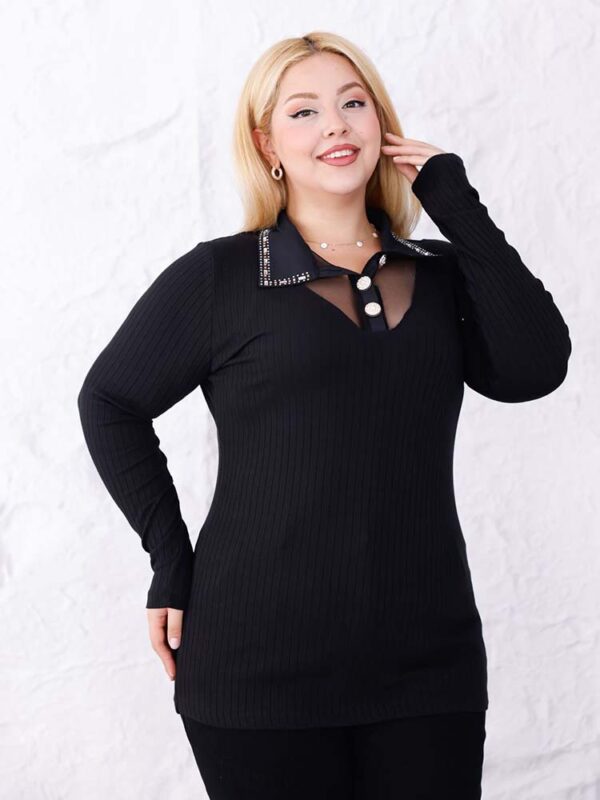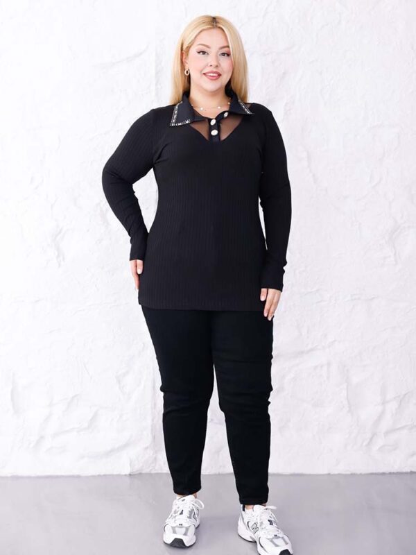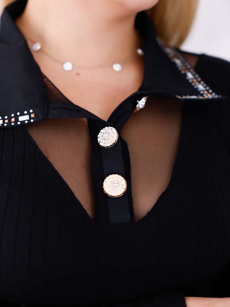 Stylowa bluzka z długim rękawem wykonana z elastycznej, prążkowanej dzianiny , która doskonale dopasowuje się do sylwetki . Model z eleganckim kołnierzykiem ozdobionym błyszczącymi cyrkoniami oraz efektownym wycięciem  na dekolcie z siateczki.