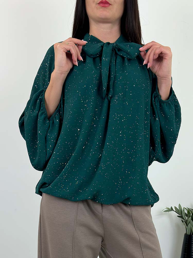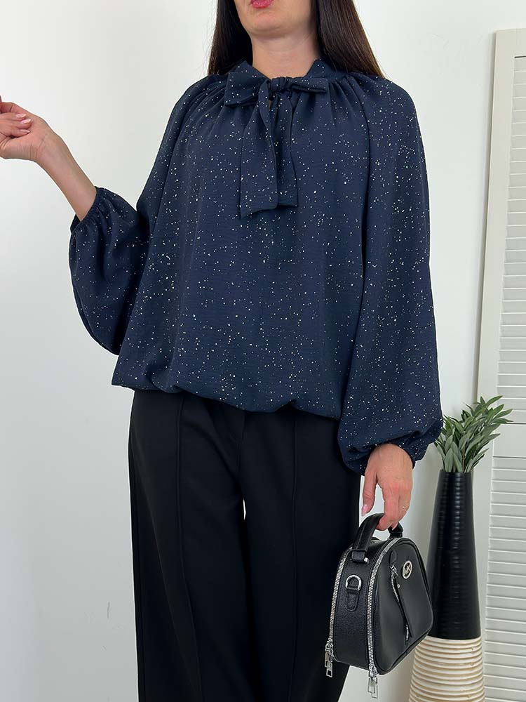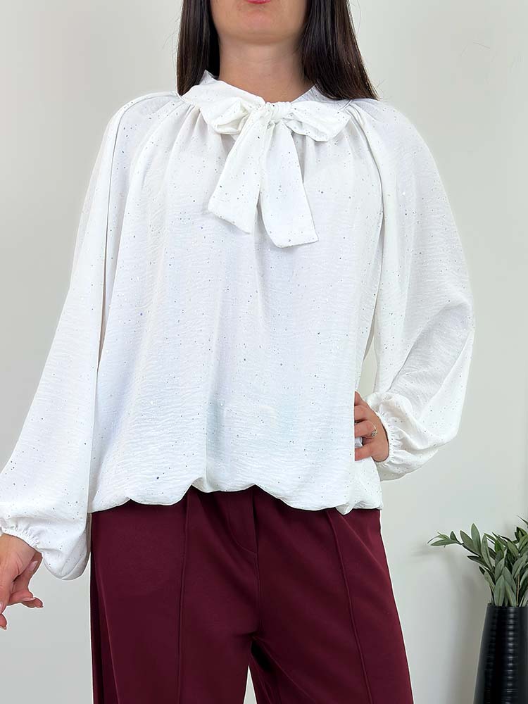 U góry elegancka kokarda nadająca bluzce klasy i stylu. Rękawy długie, bufiaste, zakończone delikatną gumką – tworzą lekki, swobodny efekt.