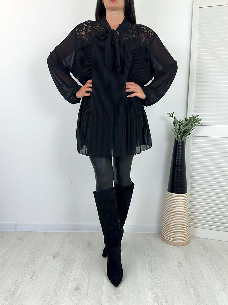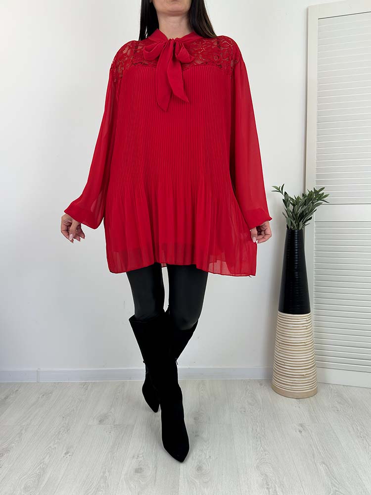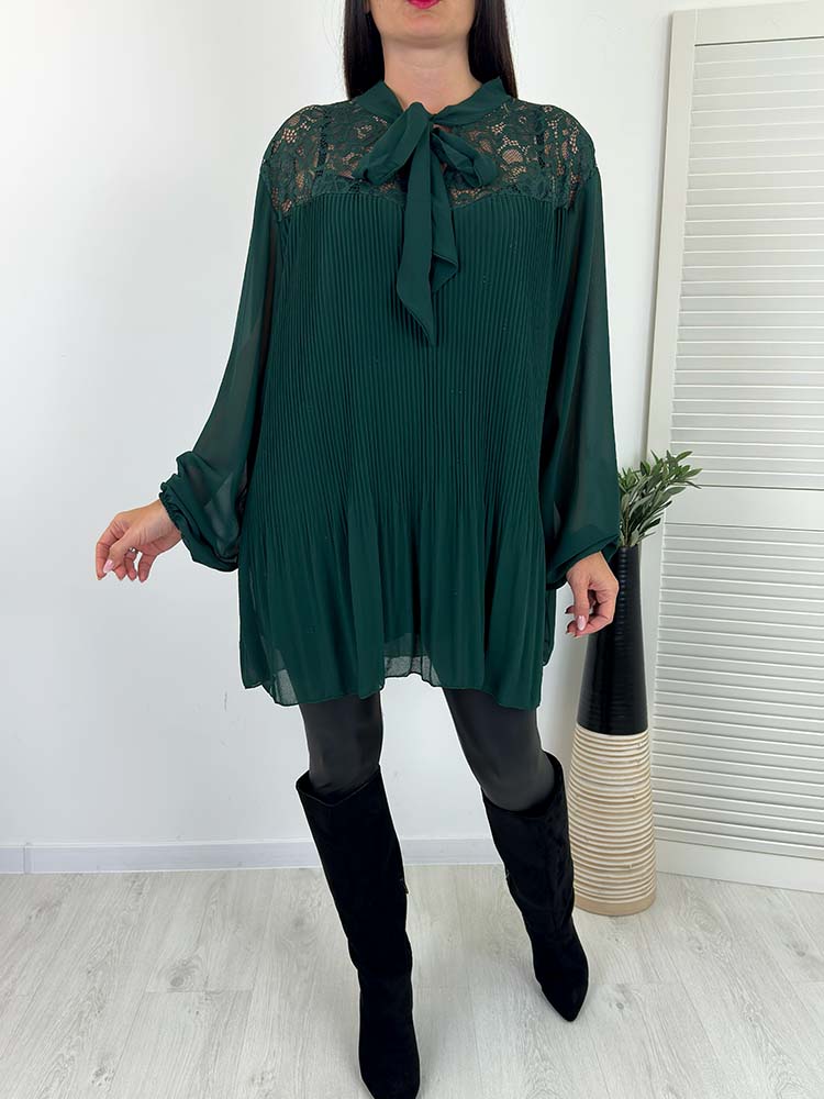 Elegancka, kobieca bluzka o luźnym kroju z delikatnym plisowaniem, wykończona kokardą przy szyi i subtelną koronką u góry.