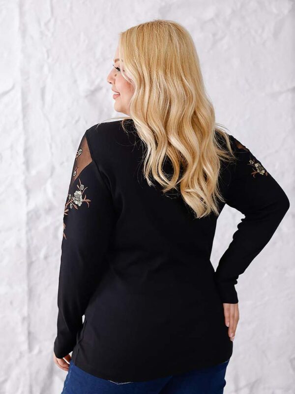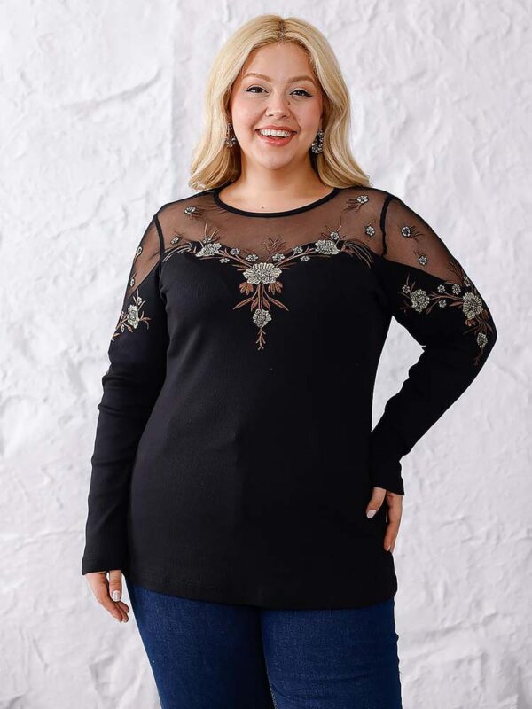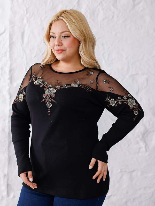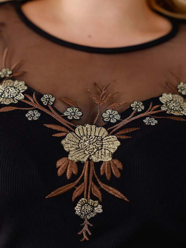 Zjawiskowa bluzka, która łączy elegancję z subtelnym romantyzmem. Górna część wykonana została z delikatnego tiulu ozdobionego efektownym haftem kwiatowym, który pięknie podkreśla dekolt i ramiona. Całość dopełnia gładka, miękka dzianina, zapewniająca wygodę noszenia i idealne dopasowanie do sylwetki.