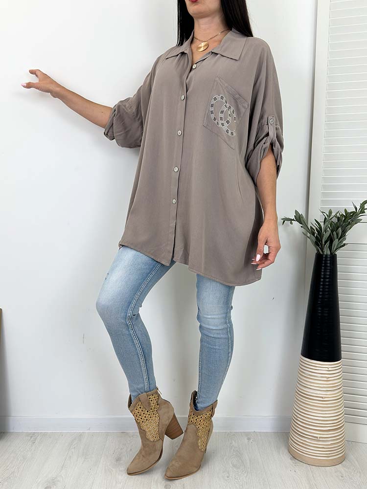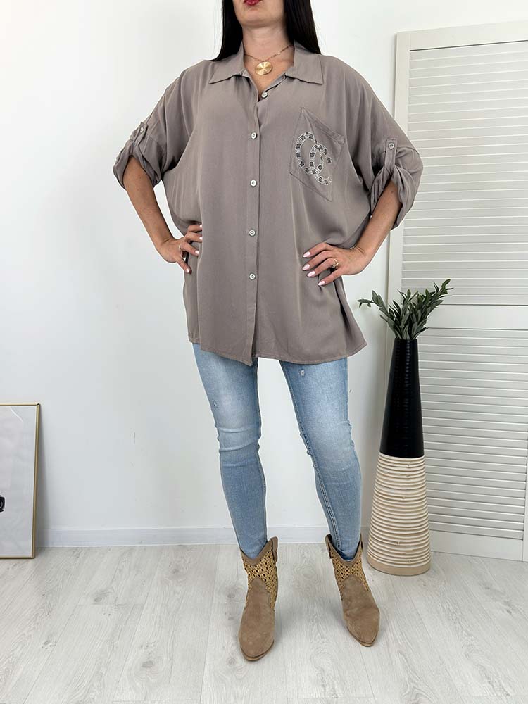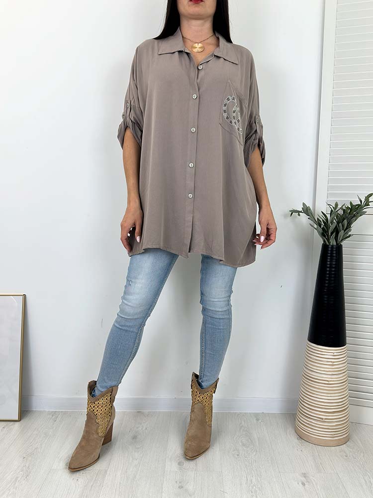 To luźny krój zapinany na guziczki .Bardzo wygodna modna i praktyczna . Idealna na co dzień, do pracy, na spotkanie . Świetnie sprawdzi się botkami lub kozakami ale także ze sportowym obuwiem i legginsami. Mega uniwersalny model. 100% wiskoza. Na kieszonce ozdobne cekiny . Podpinany rękaw.