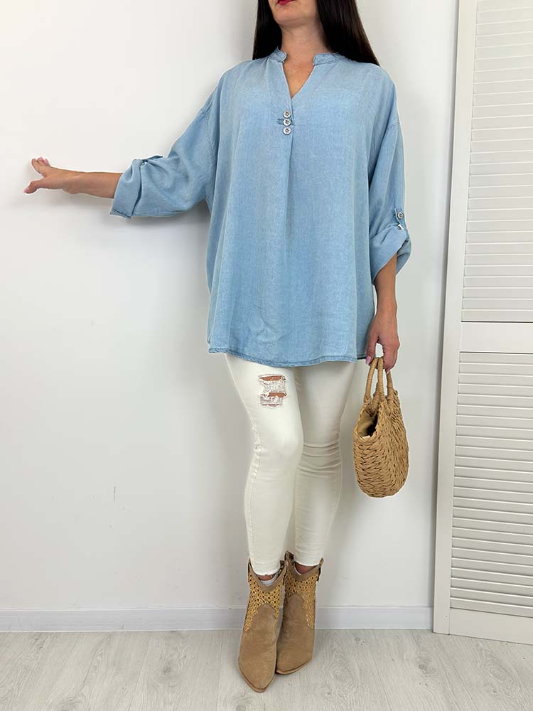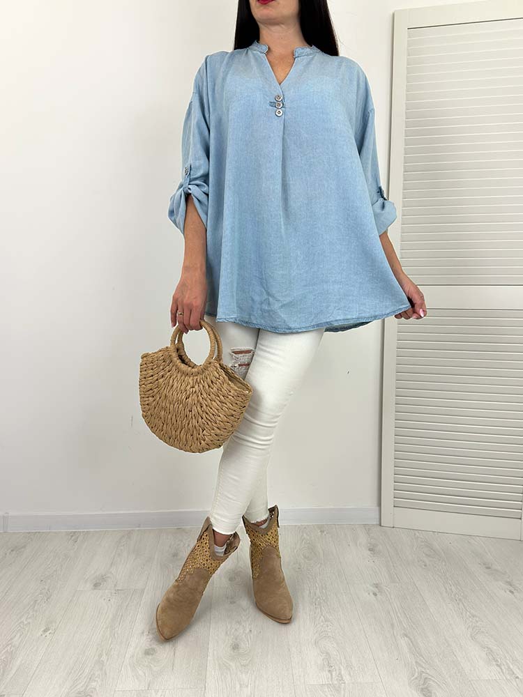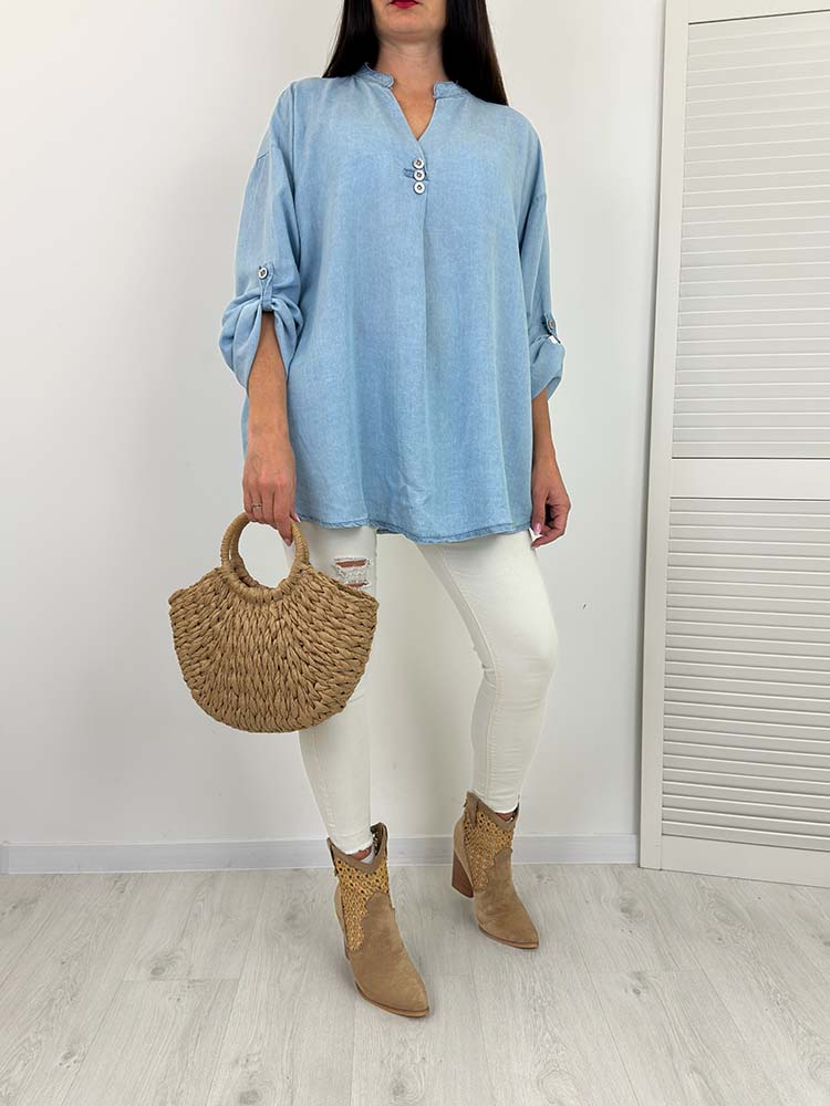 Lubisz jeansowy styl, ale cenisz sobie lekkość i swobodę? Ta bluzka oversize z tencelu to idealne połączenie stylu denim z komfortem! Ma wygląd delikatnego jeansu, ale jest znacznie lżejsza, bardziej przewiewna i miękka – pokochasz ją od pierwszego założenia!