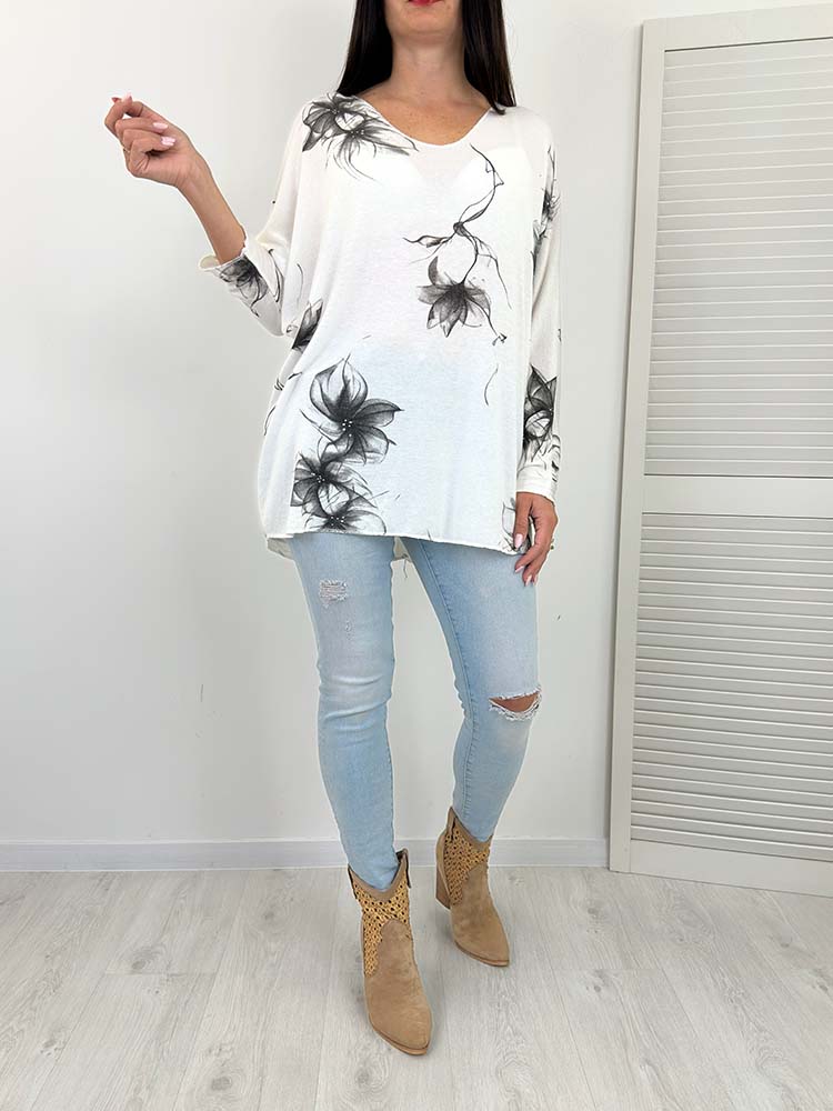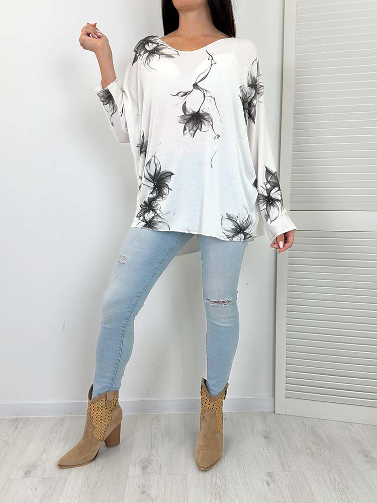Sklep / Moda / Swetry / SWETEREK LINDA w kwiaty nietoperz BIAŁY