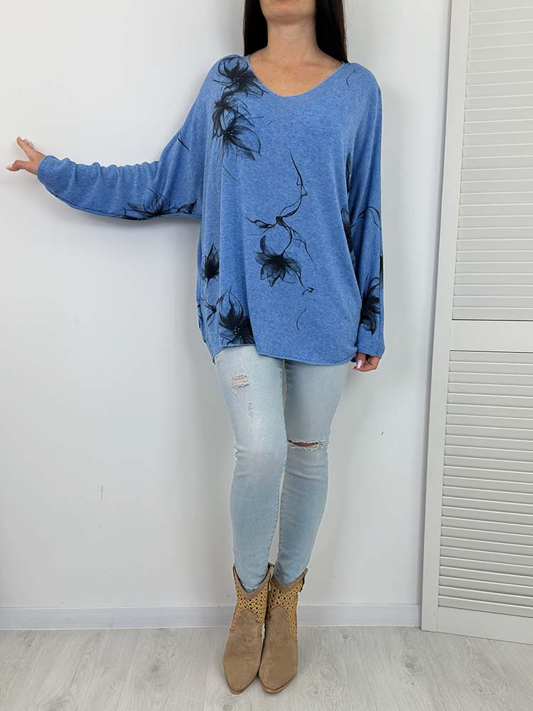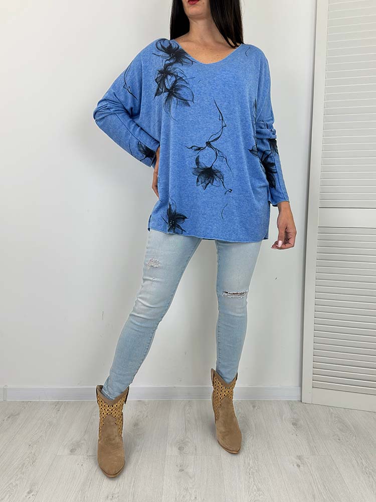 SWETEREK LINDA w kwiaty nietoperz NIEBIESKI