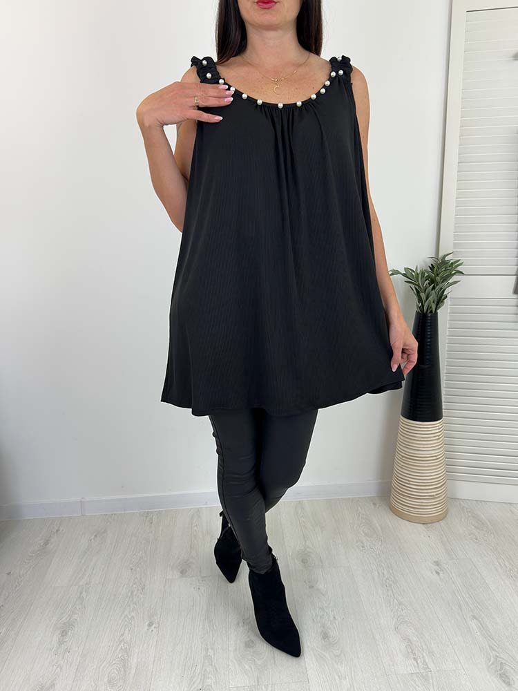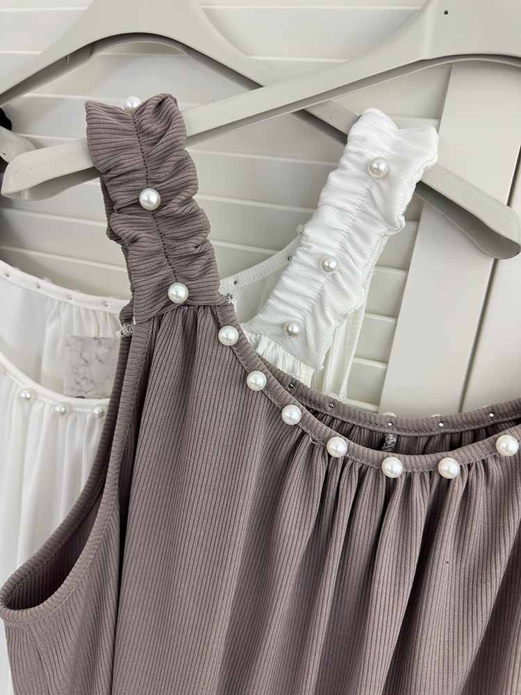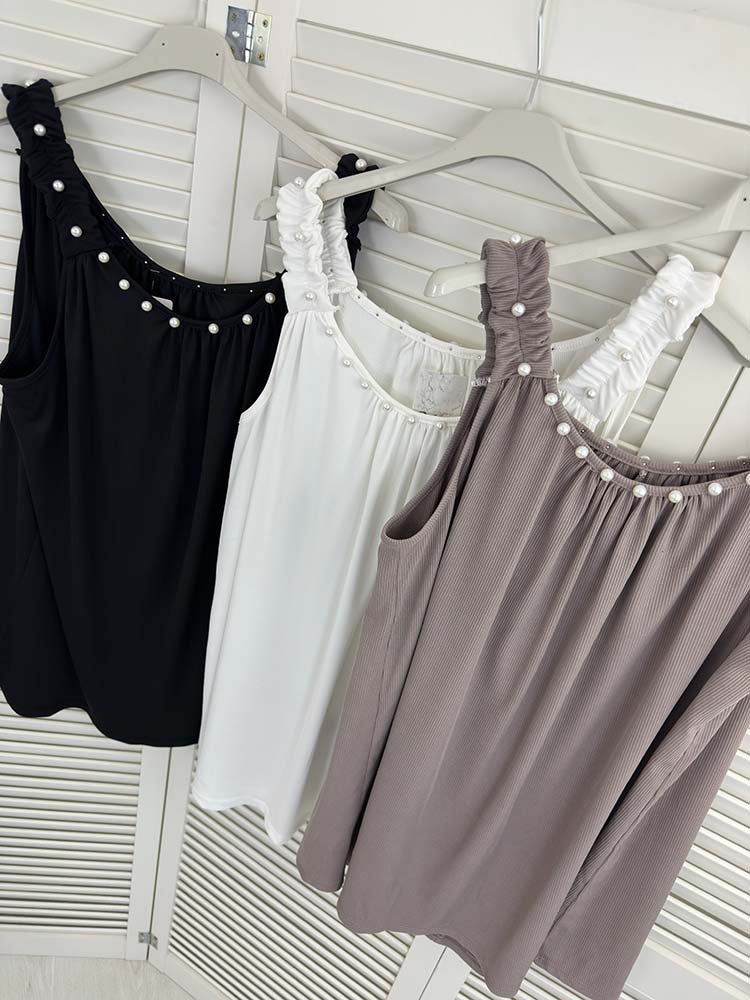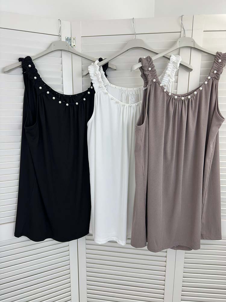 elastyczna bokserka luźna bluzka na ramiączkach , top na szerokich ramiączkach , prążkowany , luźny fason ozdobne perełki