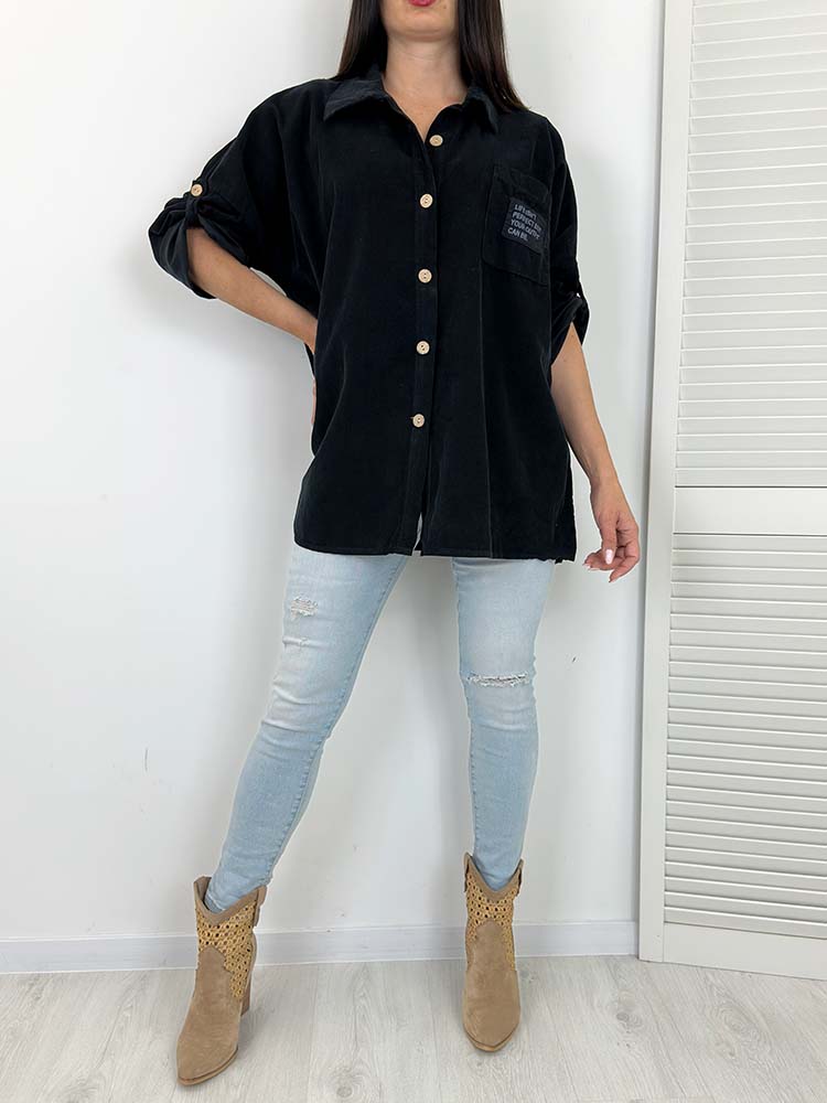 Świetna sztruksowa koszula .  To luźny krój zapinany na guziczki z modną w tym sezonie naszywką i podpinanymi rękawkami .Bardzo  wygodna modna i praktyczna . Idealna na co dzień, do pracy, na spotkanie . Świetnie sprawdzi się botkami lub kozakami ale także ze sportowym obuwiem i legginsami. Mega uniwersalny model