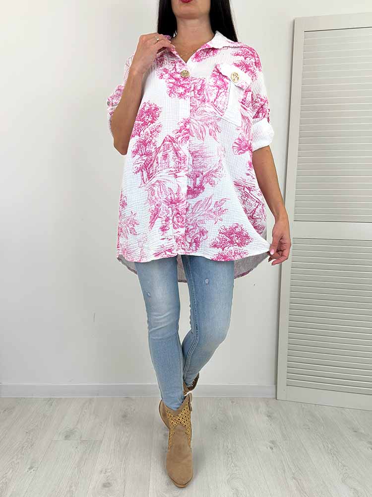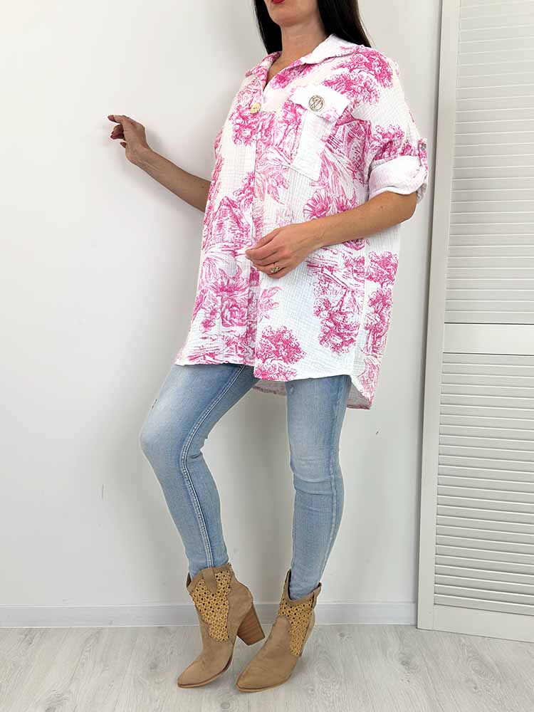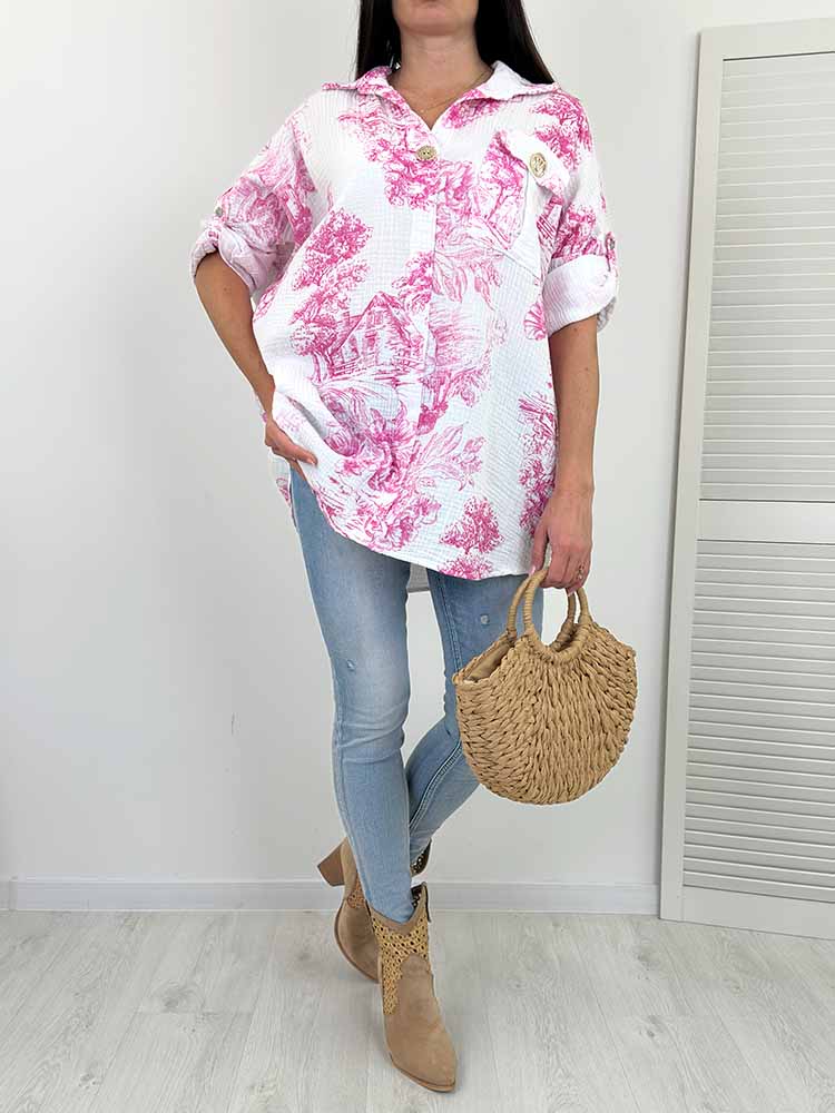 PLUS SIZE Koszula muślinowa to stylowy wybór dla każdej kobiety. Ozdobny guzik przy dekolcie, podpinane rękawy, luźny krój, dłuższy tył, ozdobna broszka