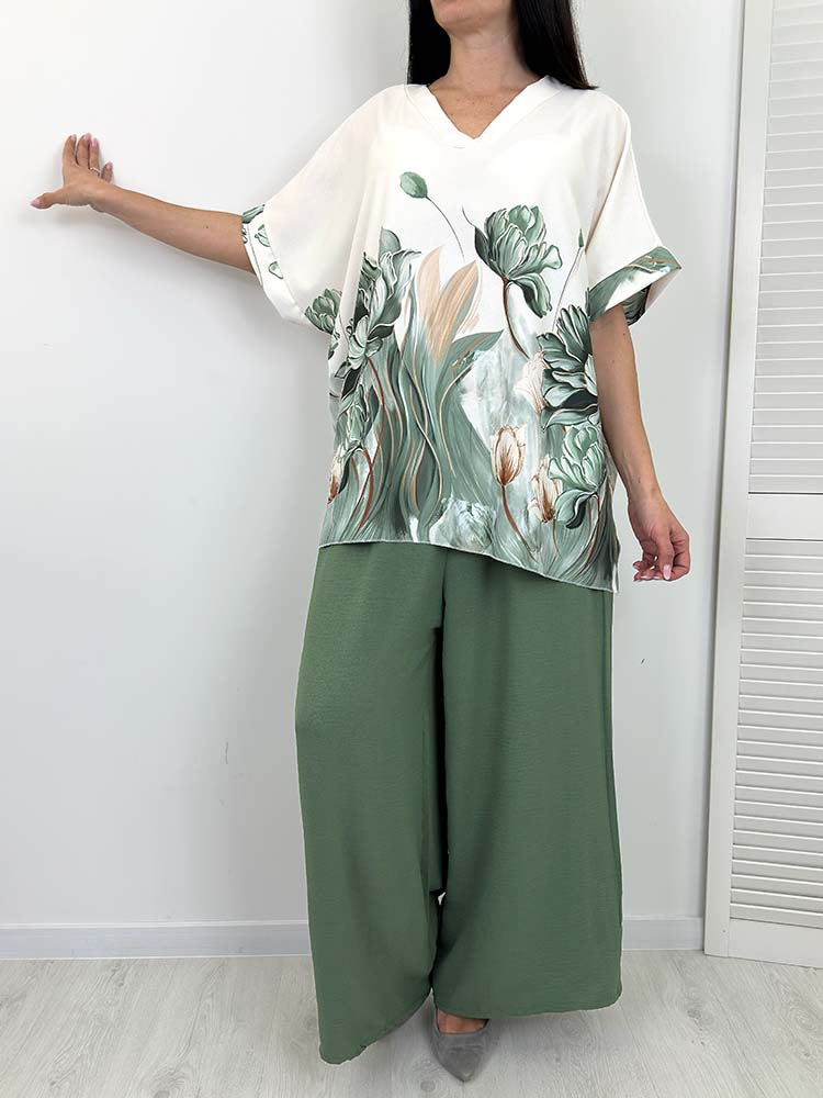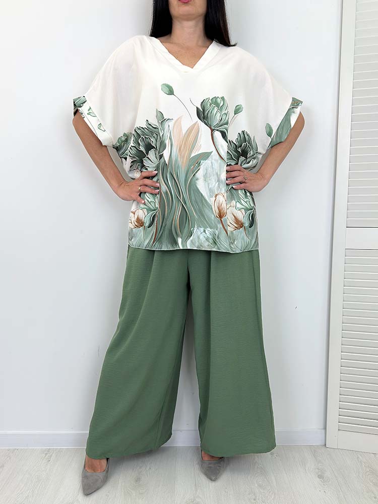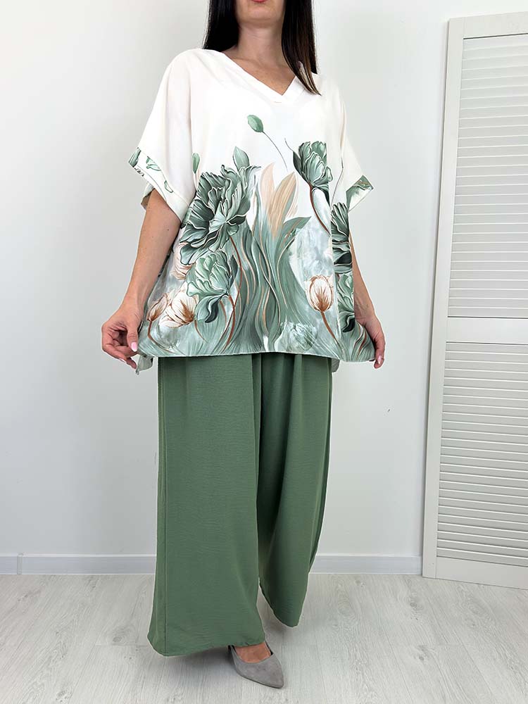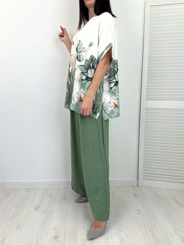 KOMPLET KAREN SPODNIE +BLUZKA khaki w kwiaty