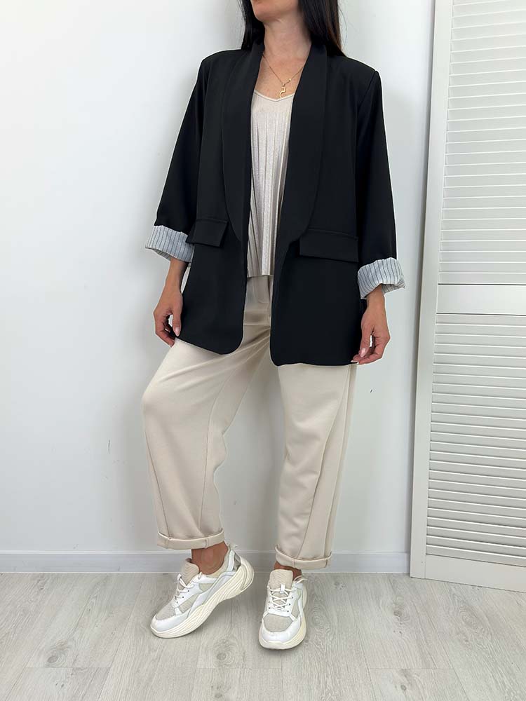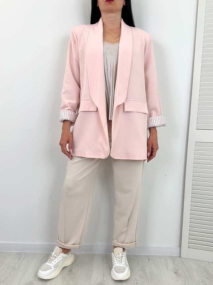Wygodna i świetnie skrojona, o klasycznym  fasonie. Podwijane rękawki z paskami wzorem .