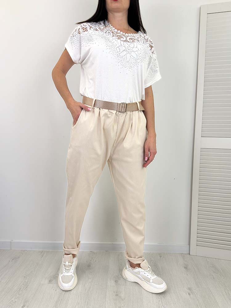 RIBO spodnie plus szie BOYFRIENDY z paskiem kremowe