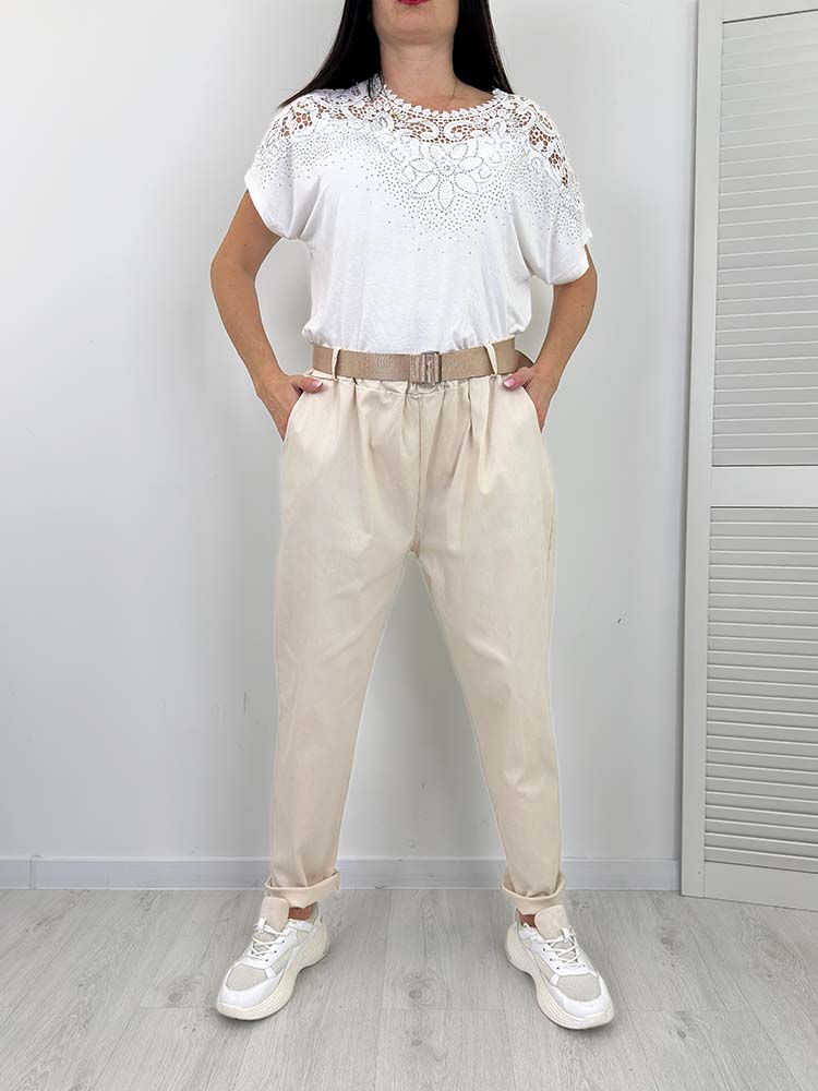 Sklep / Moda / Spodnie / spodenki / RIBO spodnie plus szie BOYFRIENDY z paskiem kremowe