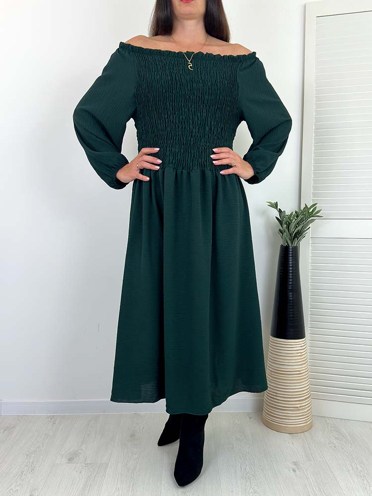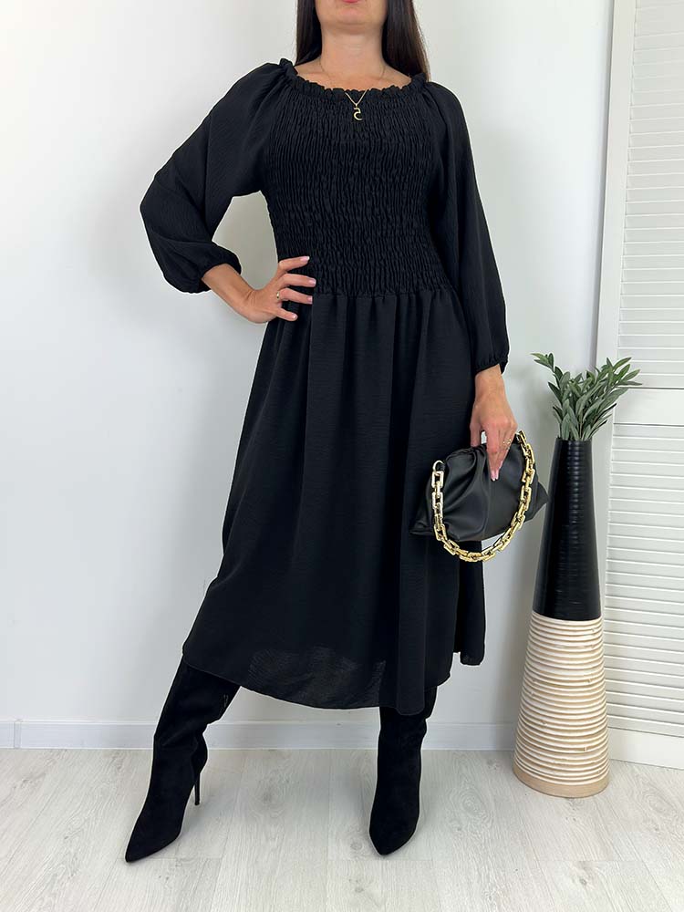 Niezwykle efektowna sukienka, świetnie sprawdzi się przy wielu okazjach.Dekolt drapowany pięknie podkreśla biust, można nosić klasycznie lub jak hiszpankę . Długie rękawy lekko rozszerzone z gumeczkami. Sukienka jest niezwykle kobieca, wygodna i modna. Dzięki przyjemnemu materiałowi, lekkiemu fasonowi prezentuje się niezwykle świeżo.