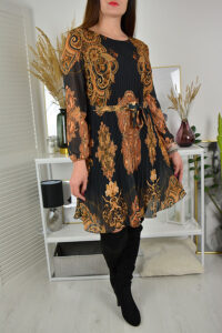 Plisowana z wzorem, wiązana paseczkiem. Rękawy wykończone gumeczką , sukienka jest niezwykle wygodna i praktyczna. Dzięki przyjemnemu materiałowi, lekkiemu fasonowi , sukienka prezentuje się modnie i elegancko . Idealnie sprawdzi się na uroczystości rodzinne, imprezę, święta, czy też randkę.
