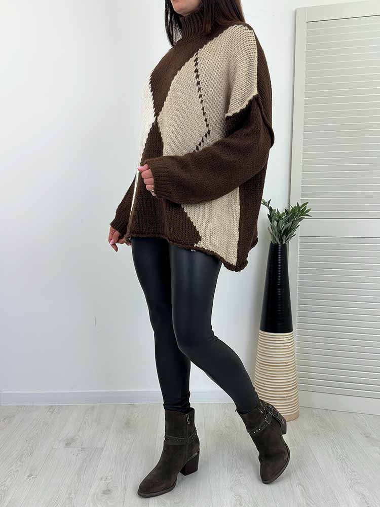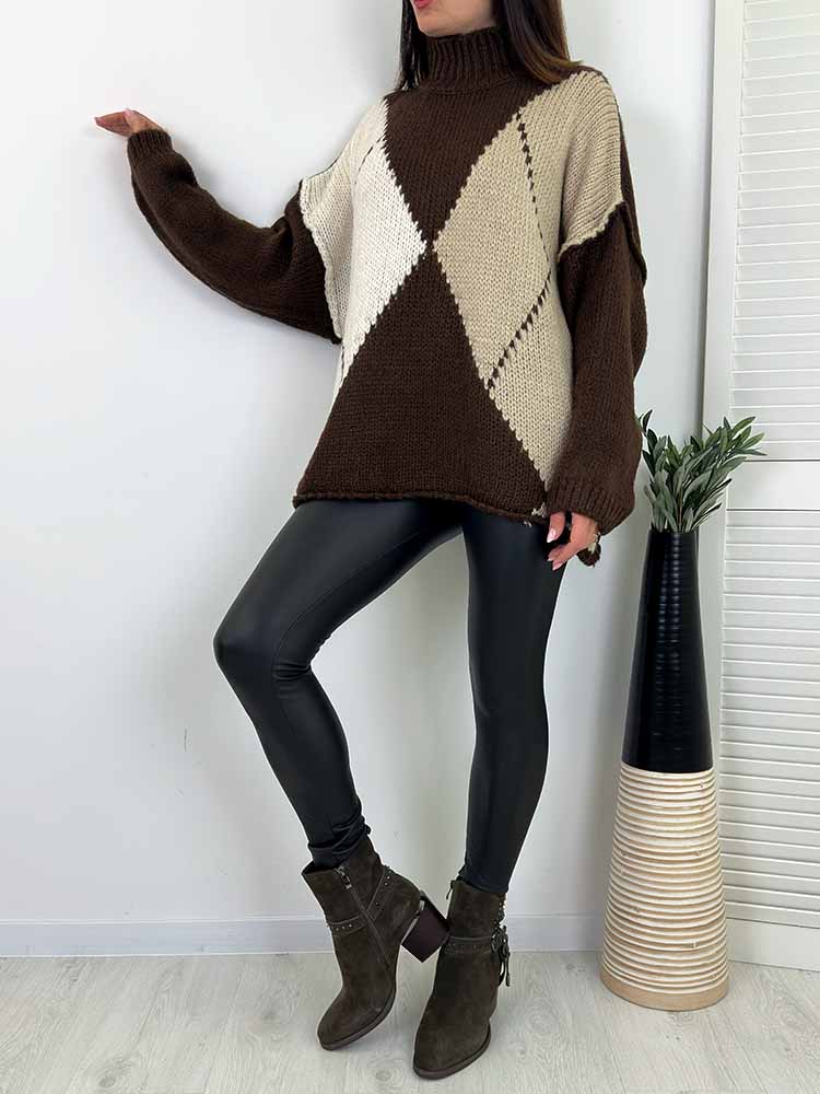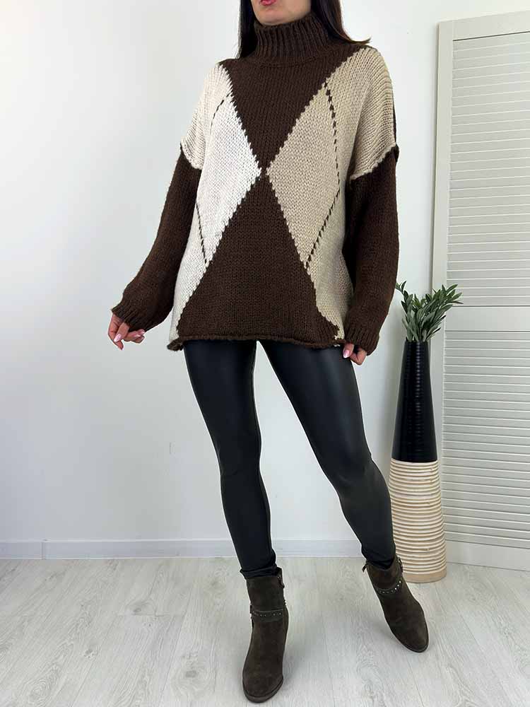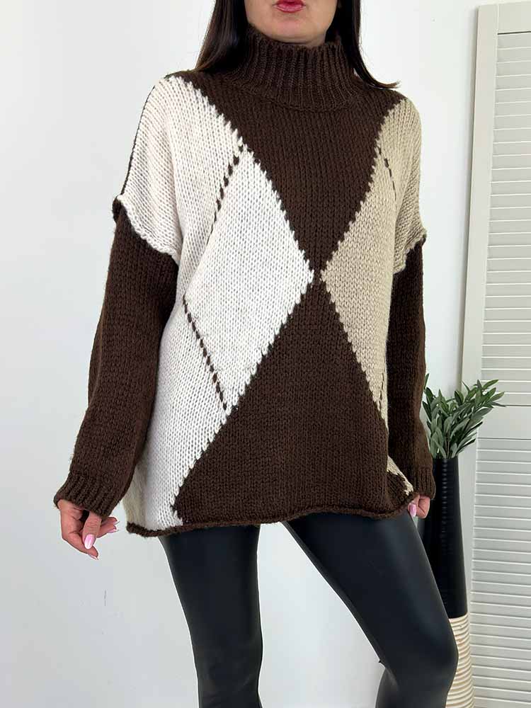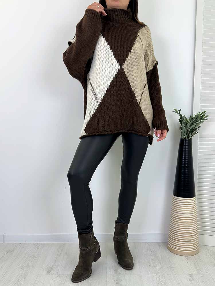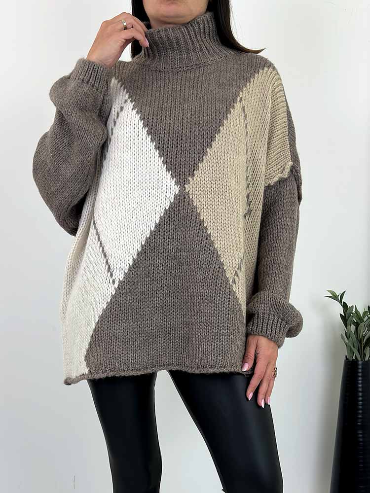 Model z wysokim golfem, wykonany z przyjemnej w dotyku dzianiny. Duże, kontrastowe romby w beżowo-kremowych tonach dodają mu charakteru i sprawiają, że świetnie komponuje się z legginsami, jeansami czy spódnicą.