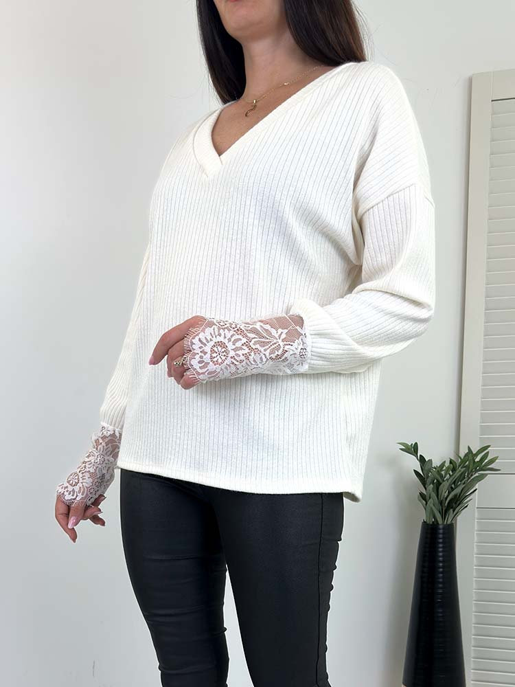 Elegancki, kobiecy sweter o luźnym kroju, który pięknie układa się na sylwetce. Model wykonany z prążkowanej dzianiny, bardzo miękkiej i przyjemnej w dotyku. Największym atutem są koronkowe wstawki na mankietach, które dodają wyjątkowego, zmysłowego charakteru.Dekolt w kształcie litery V optycznie wysmukla szyję, a lekko opuszczone ramiona nadają stylowy, nowoczesny look.