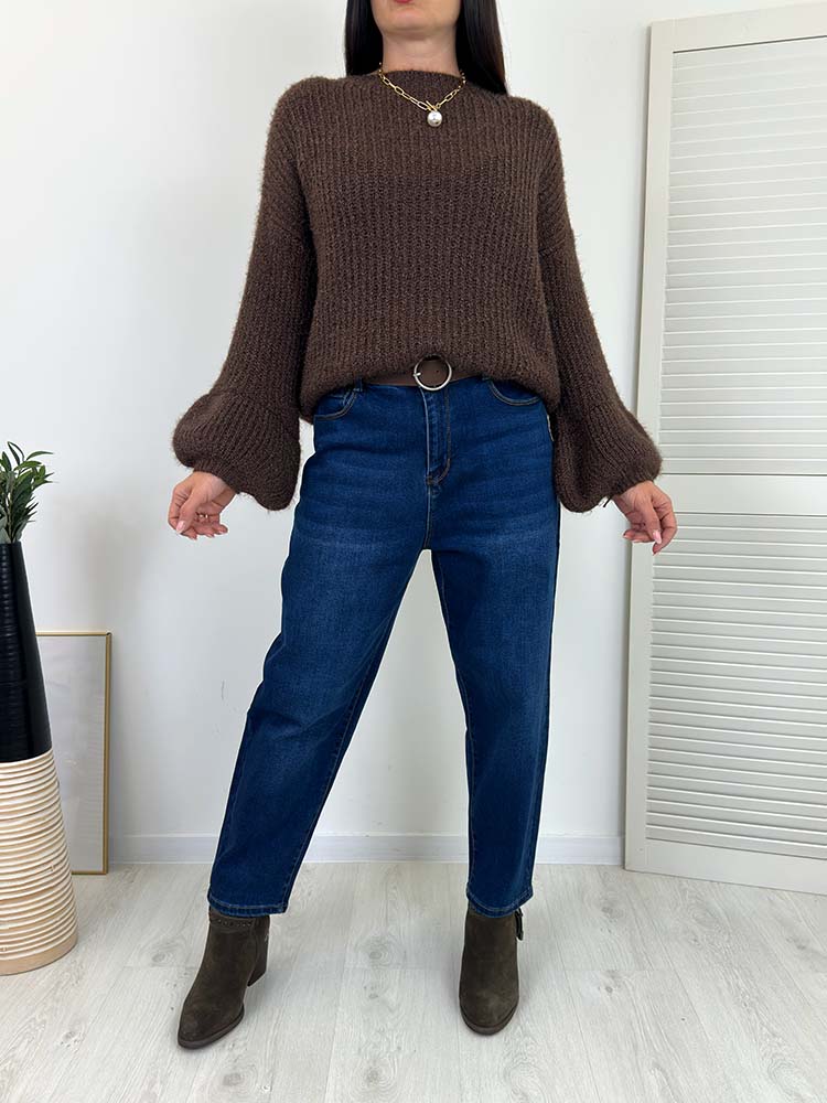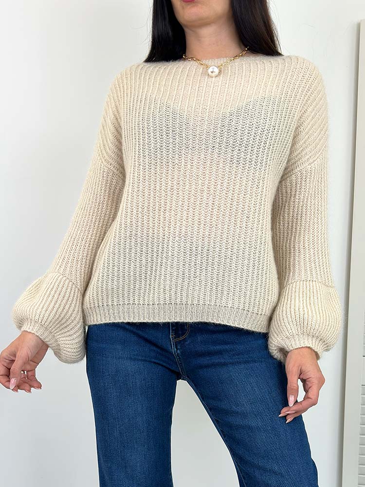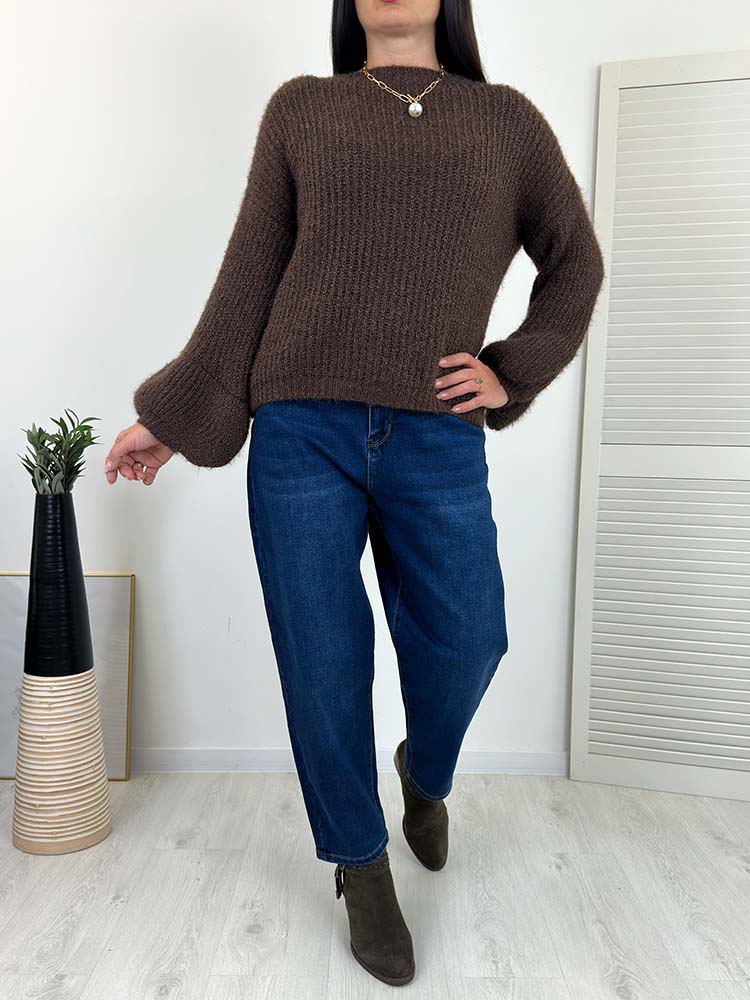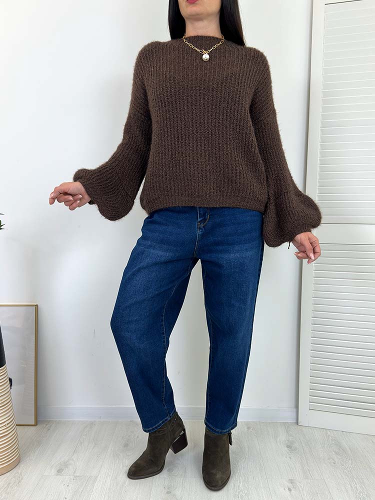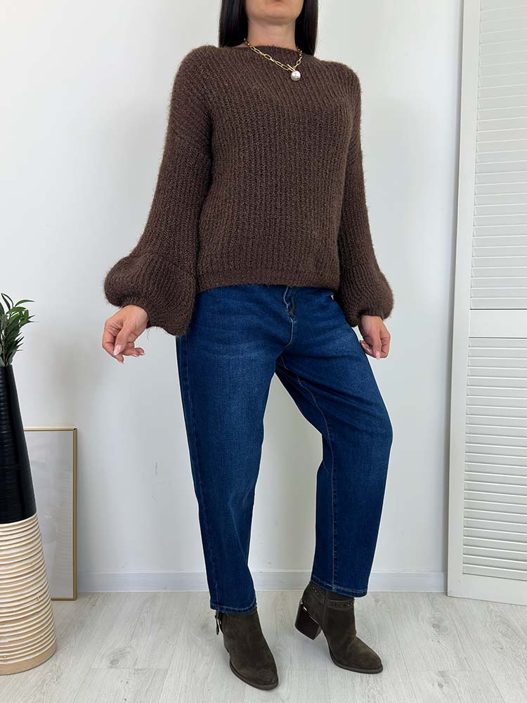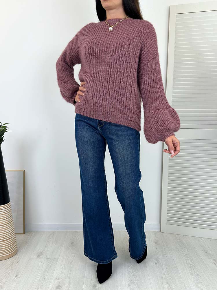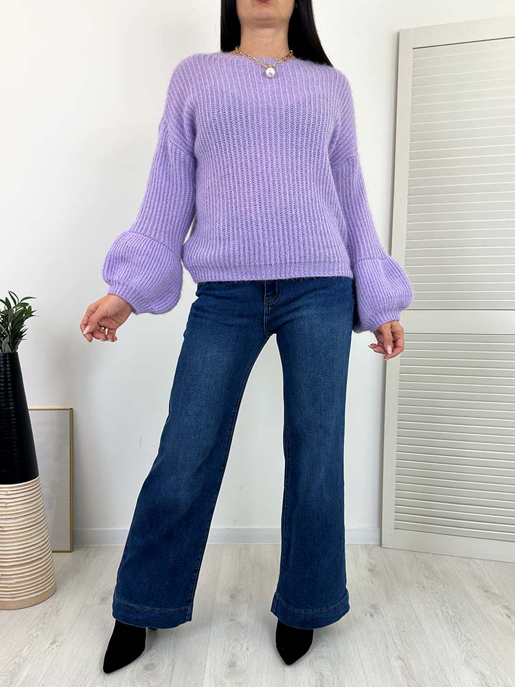 Model wyróżnia się rękawem bufka zakończonym dzwonkiem, który dodaje całości kobiecego i modnego charakteru. Luźny fason sprawia, że sweter nie opina i dobrze wygląda na różnych sylwetkach.