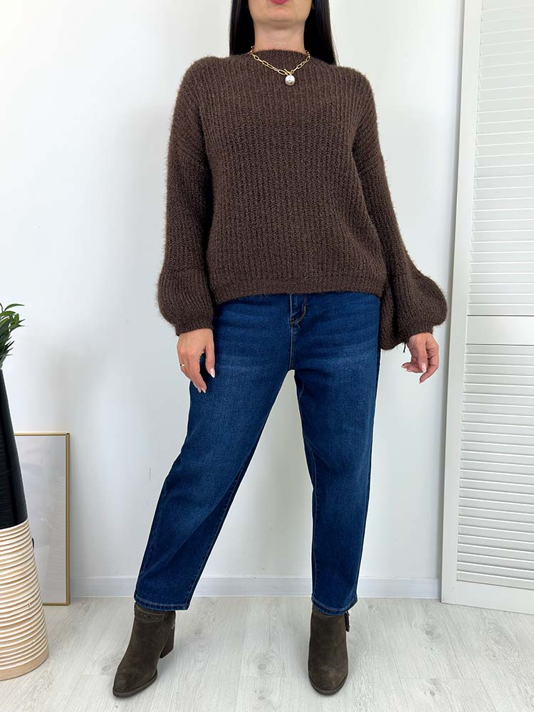 Miękki, puszysty sweter typu włochacz, który otula i wygląda bardzo stylowo. Wykonany z przyjemnej w dotyku, elastycznej dzianiny, pięknie układa się na sylwetce i zapewnia pełen komfort noszenia.