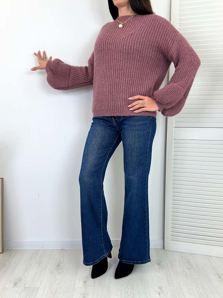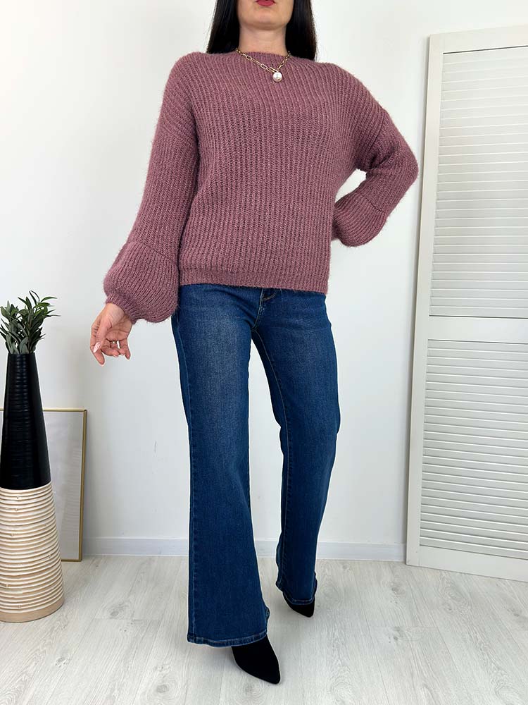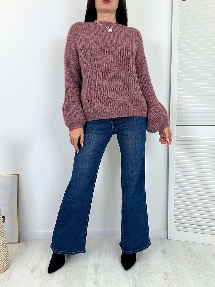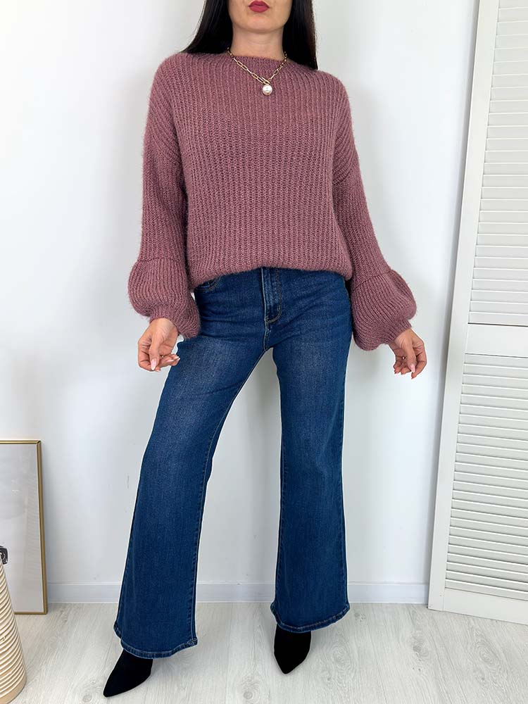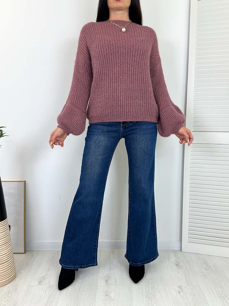 Model wyróżnia się rękawem bufka zakończonym dzwonkiem, który dodaje całości kobiecego i modnego charakteru. Luźny fason sprawia, że sweter nie opina i dobrze wygląda na różnych sylwetkach.