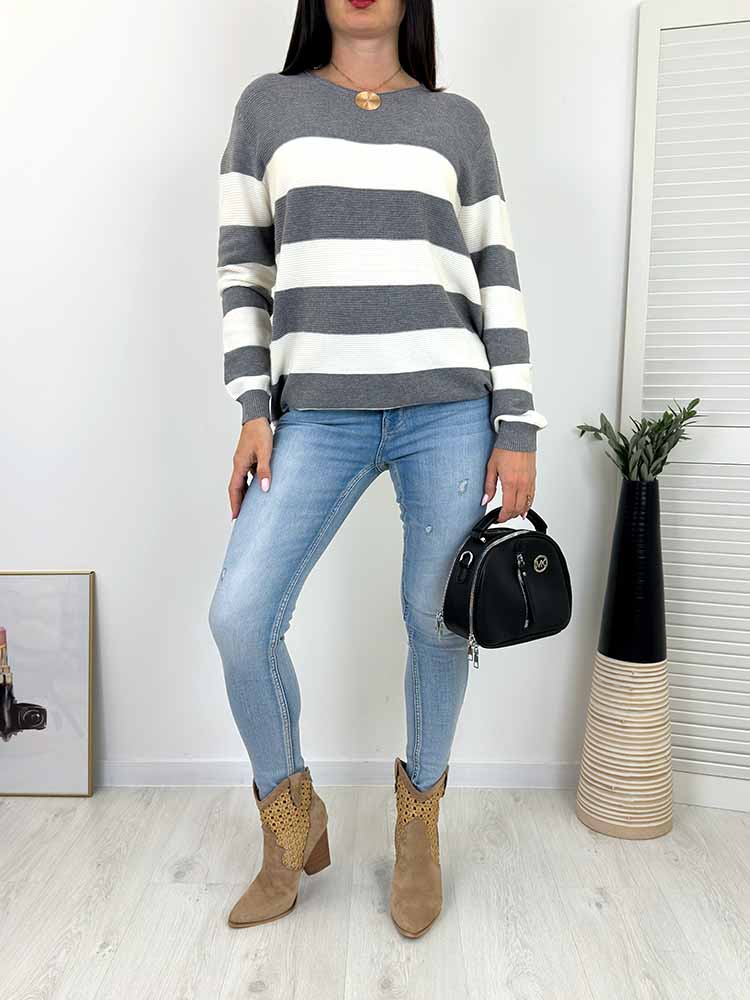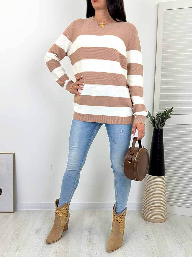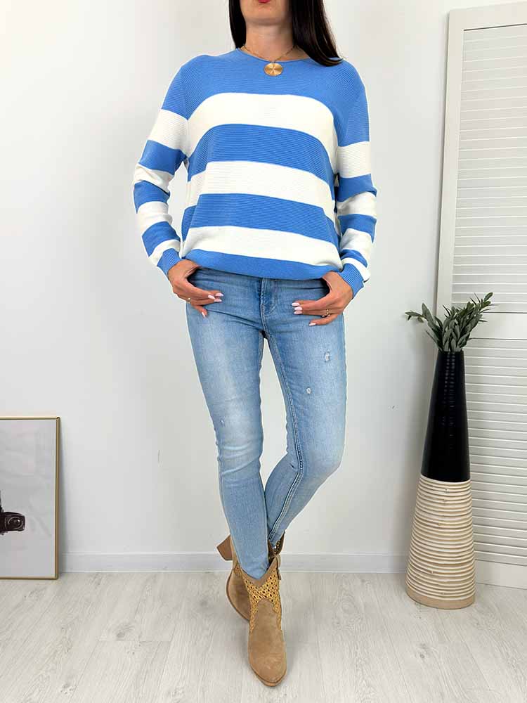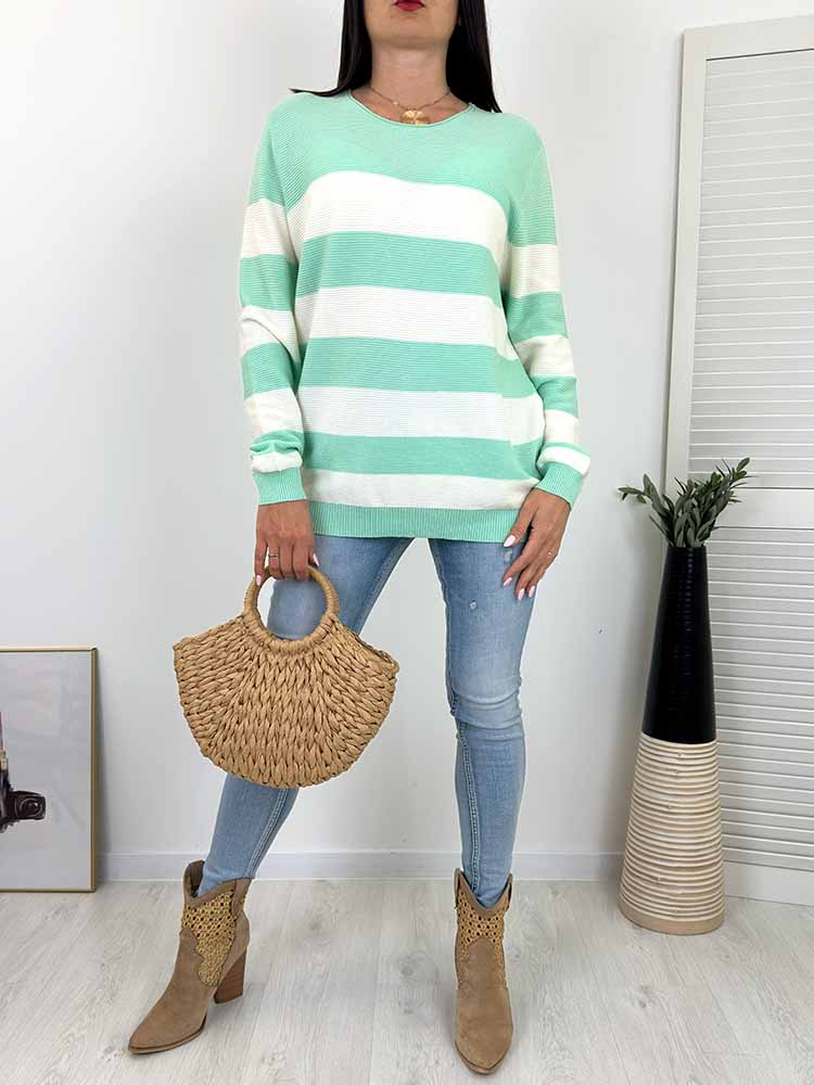 WYGODNY WIOSENNY SWETEREK wykonany z miękkiej przędzy W szerokie paski , dekolt okrągły.