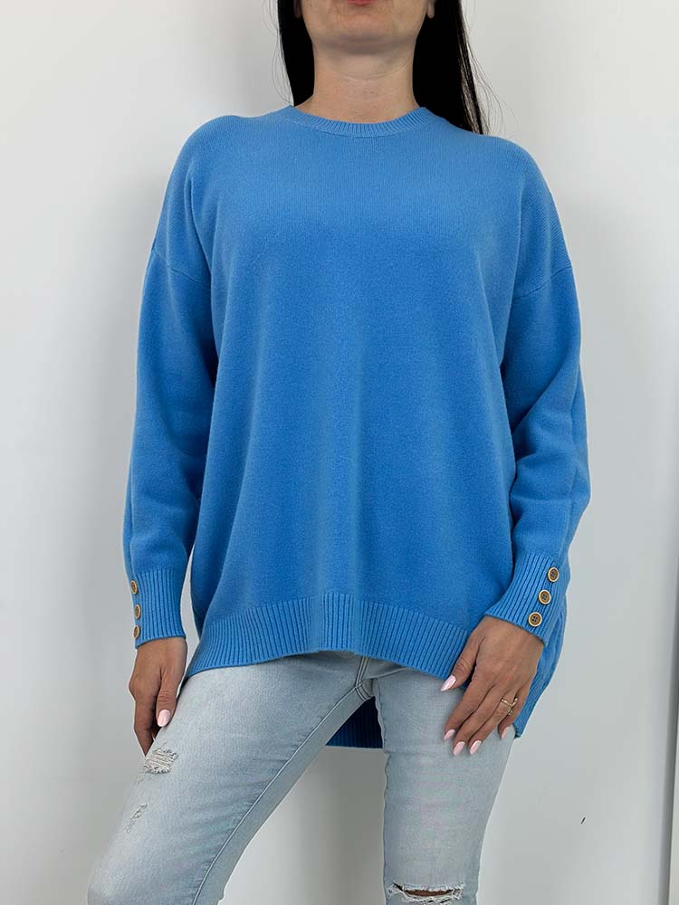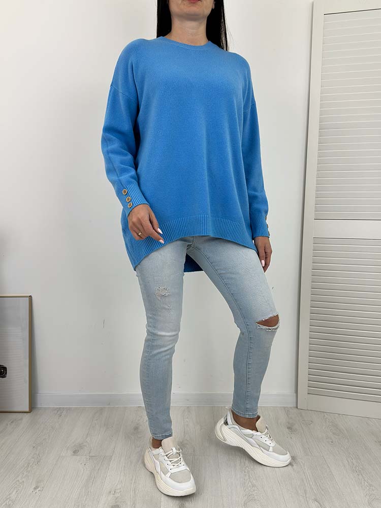 WYGODNY SWETEREK  wykonany z miękkiej przędzy . Dłuższy,  OKRĄGŁY  DEKOLT, OZDOBNE GUZIKI NA RĘKAWACH