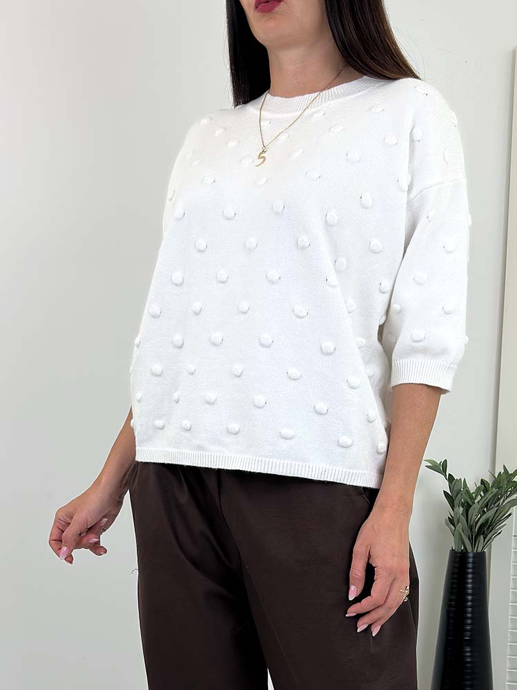 Stylowy , miękki sweter w wypukle kropki . Wykonany z przyjemnej dzianiny . Idealnie wpisuje się w najnowsze trendy. Luźny fason typu oversize zapewnia wygodę i swobodę ruchów , a szerokie rękawy dodają charakteru