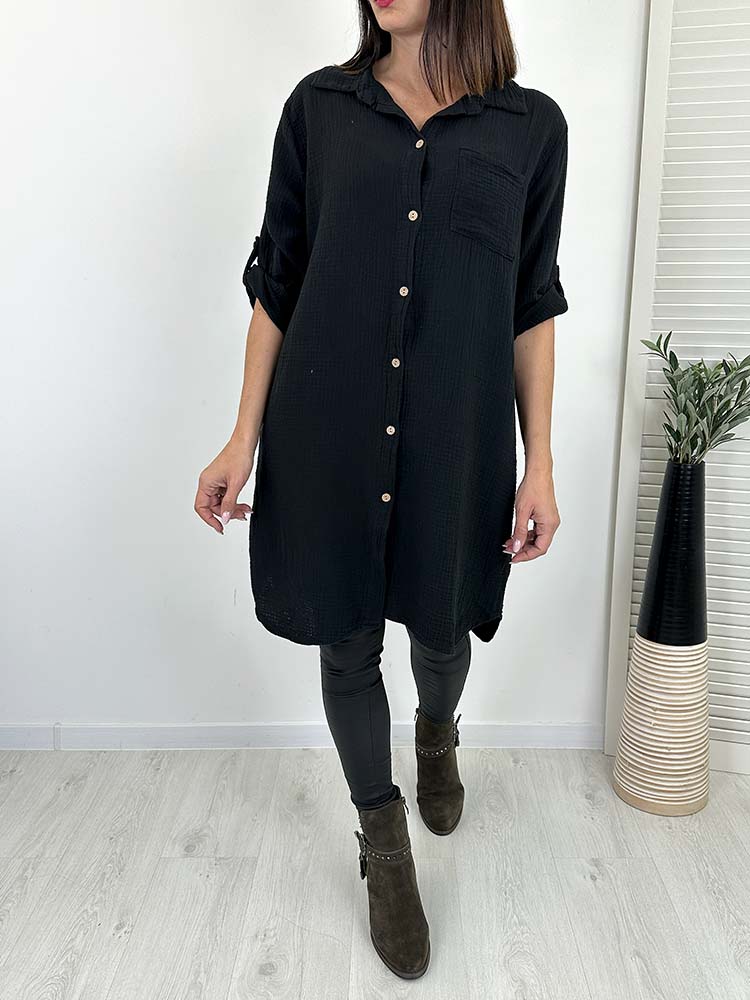 Tunika  , długa muślinowa koszulowa  to stylowy wybór dla każdej kobiety. Zapinana na guziki , podpinany rękawy, luźny krój, dłuższy tył